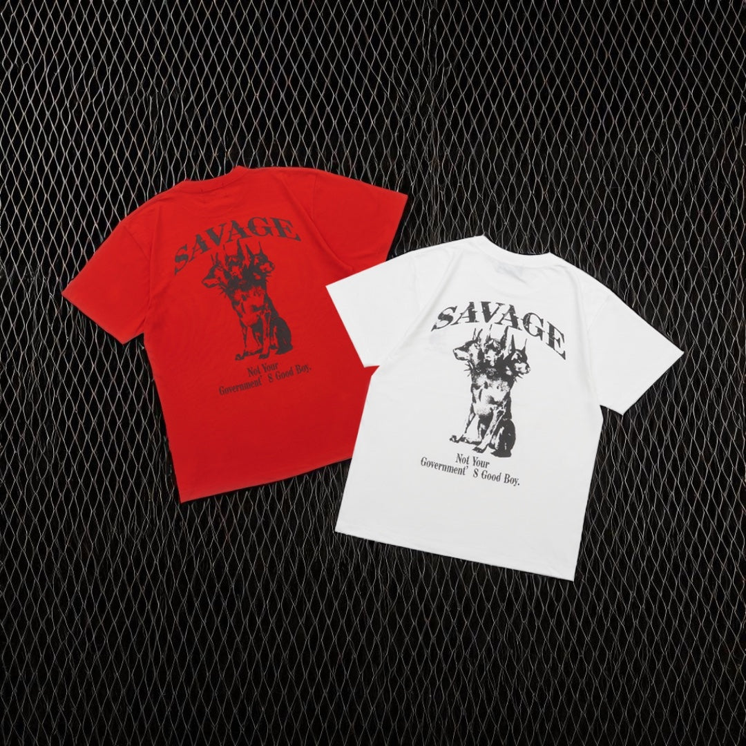 背中に大胆に配置された「GOOD BOY」グラフィックは、警察犬でも有名なドーベルマンを3つの顔を持つケルベロスモチーフに、“政府の犬じゃない”という反骨のメッセージを込めた一枚。