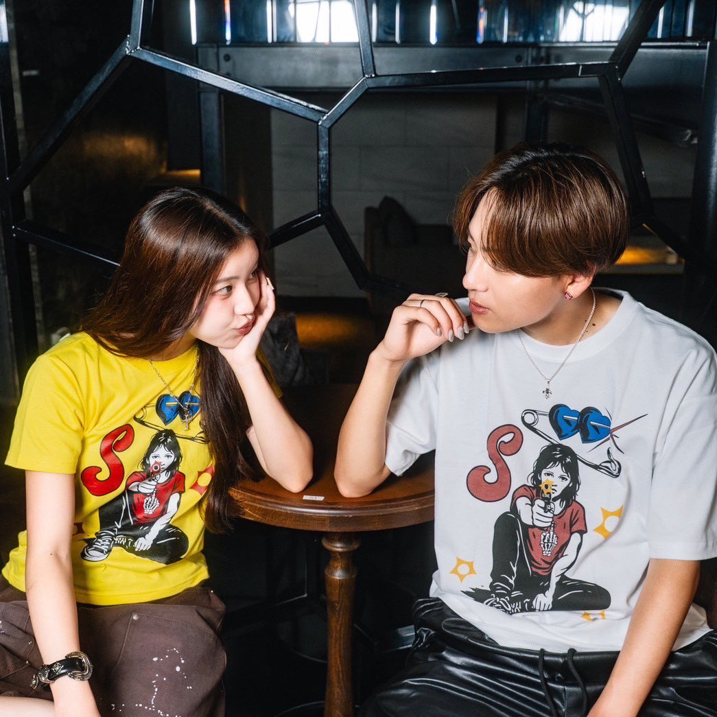 背面には“SAFE”ピクトをモチーフに、ハートを串刺しにしたアイコニックなアートを配置。